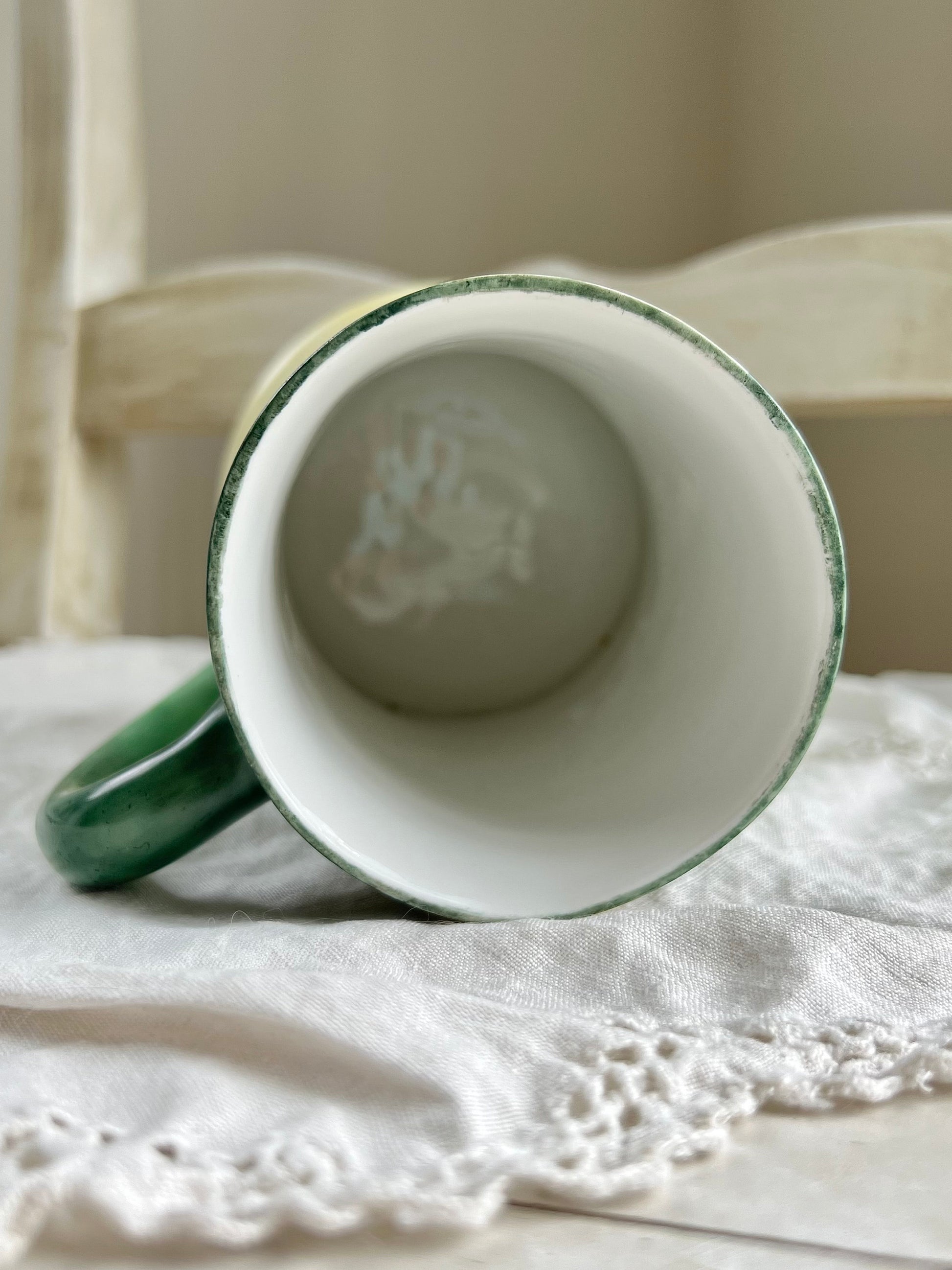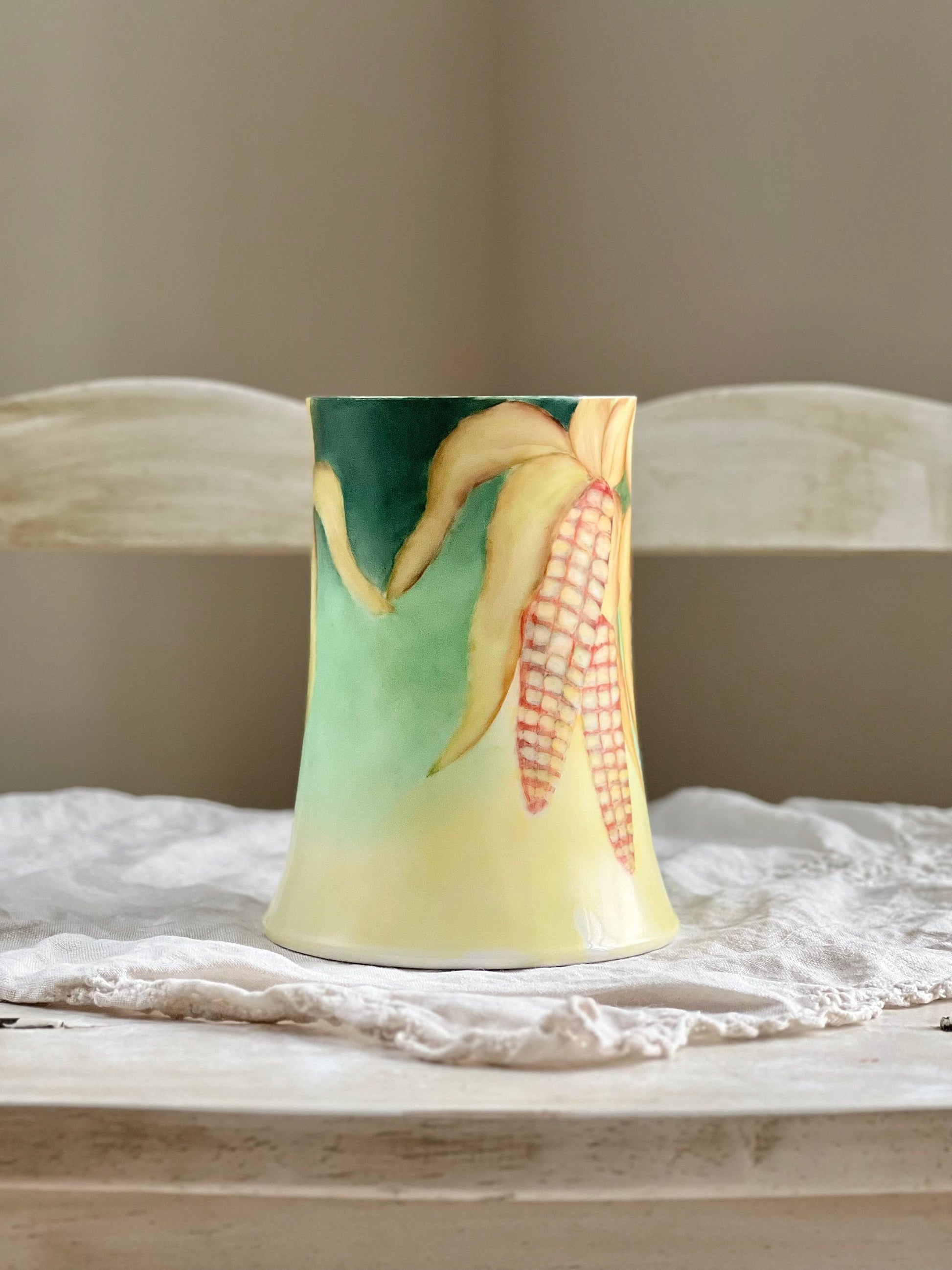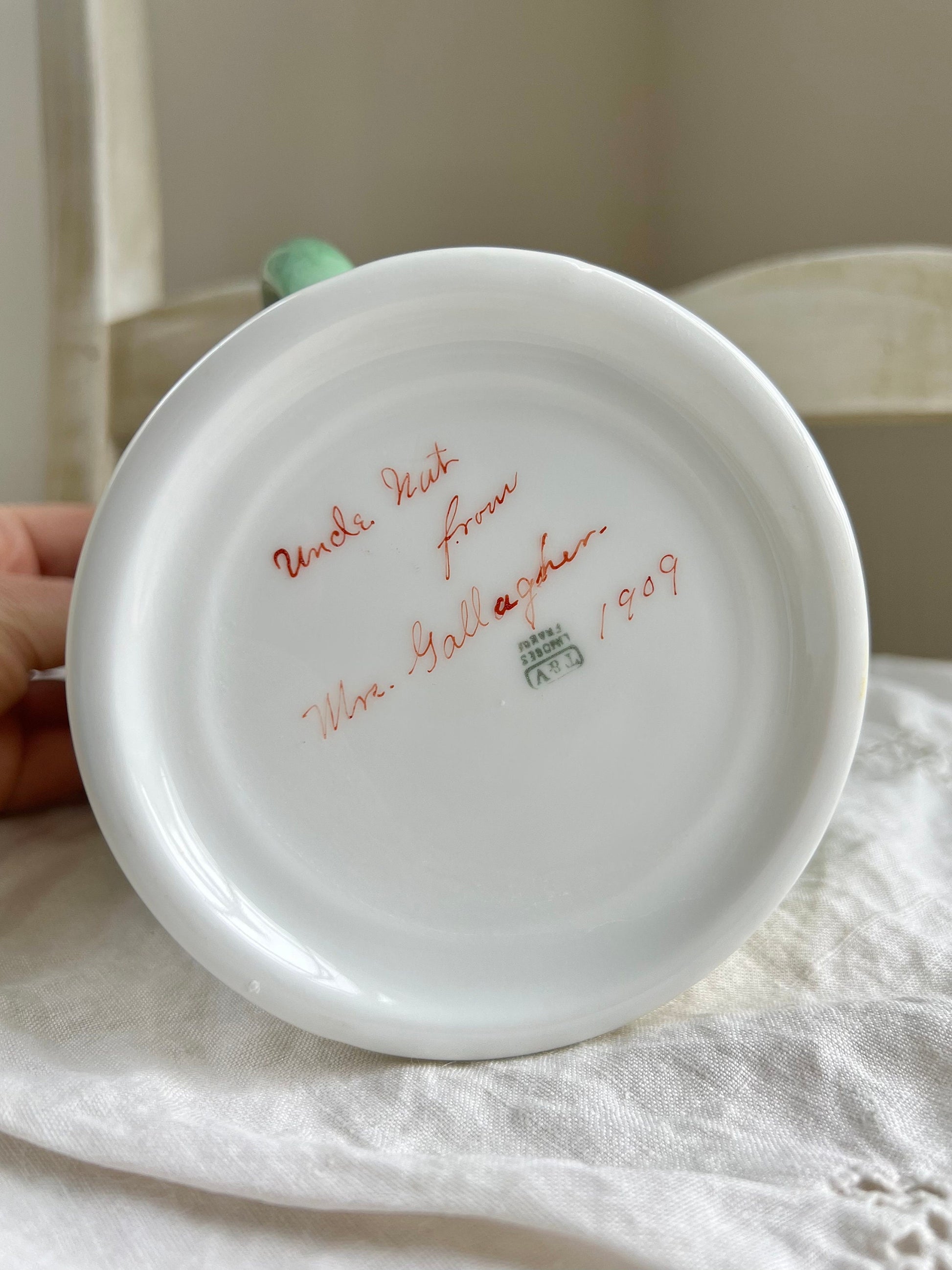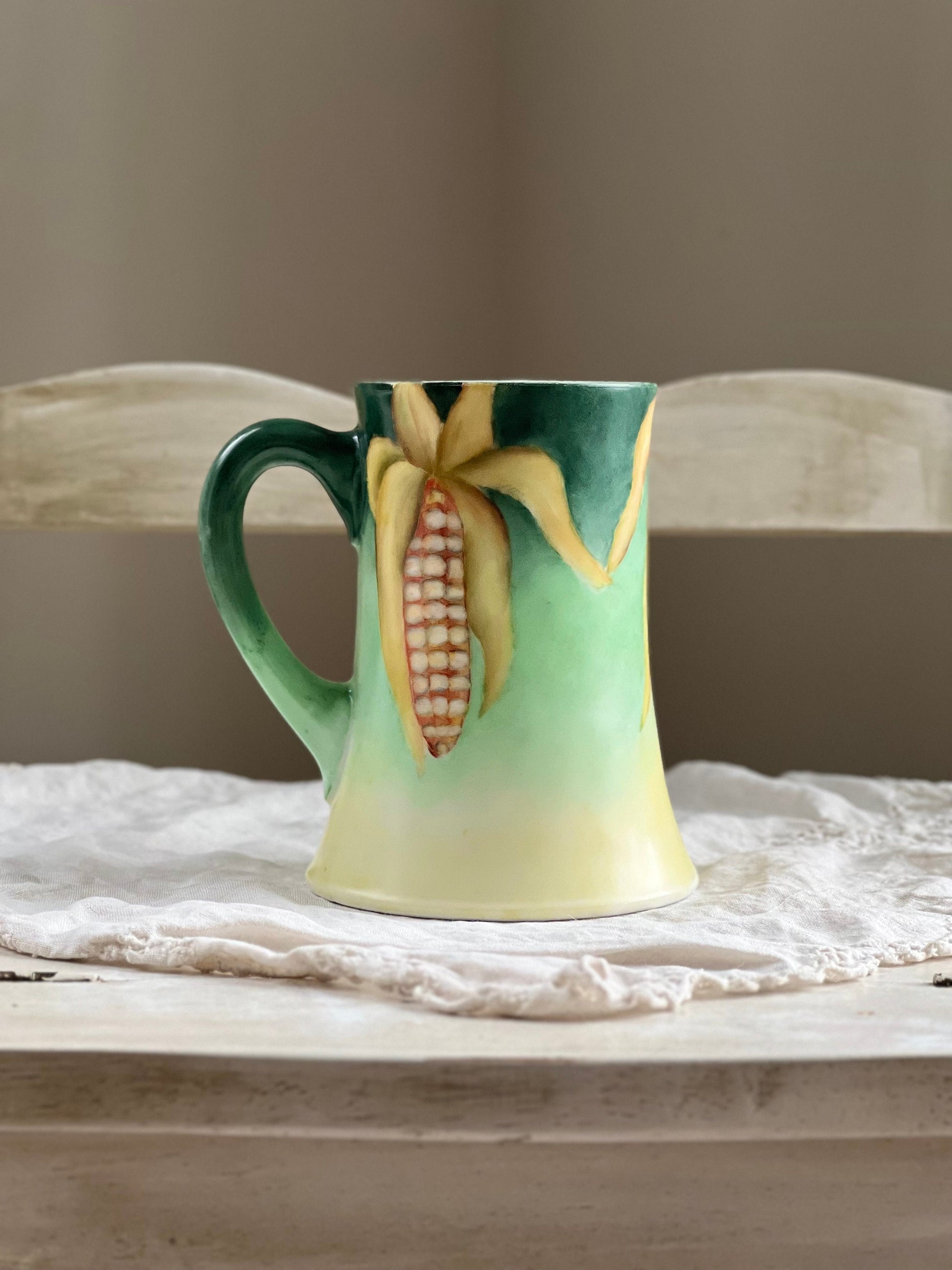 This is a wonderful antique artist signed & dated Limoges porcelain tankard mug with corn motif. The mug was made by "T & V" (Tressemann & Vogt) in France. The hand painted design is accompanied by a message from the past on the bottom: "Uncle Nut for Mr. Gallagher, 1909". This is a beautifully painted one-of-a-kind mug with a rare to find agricultural motif!