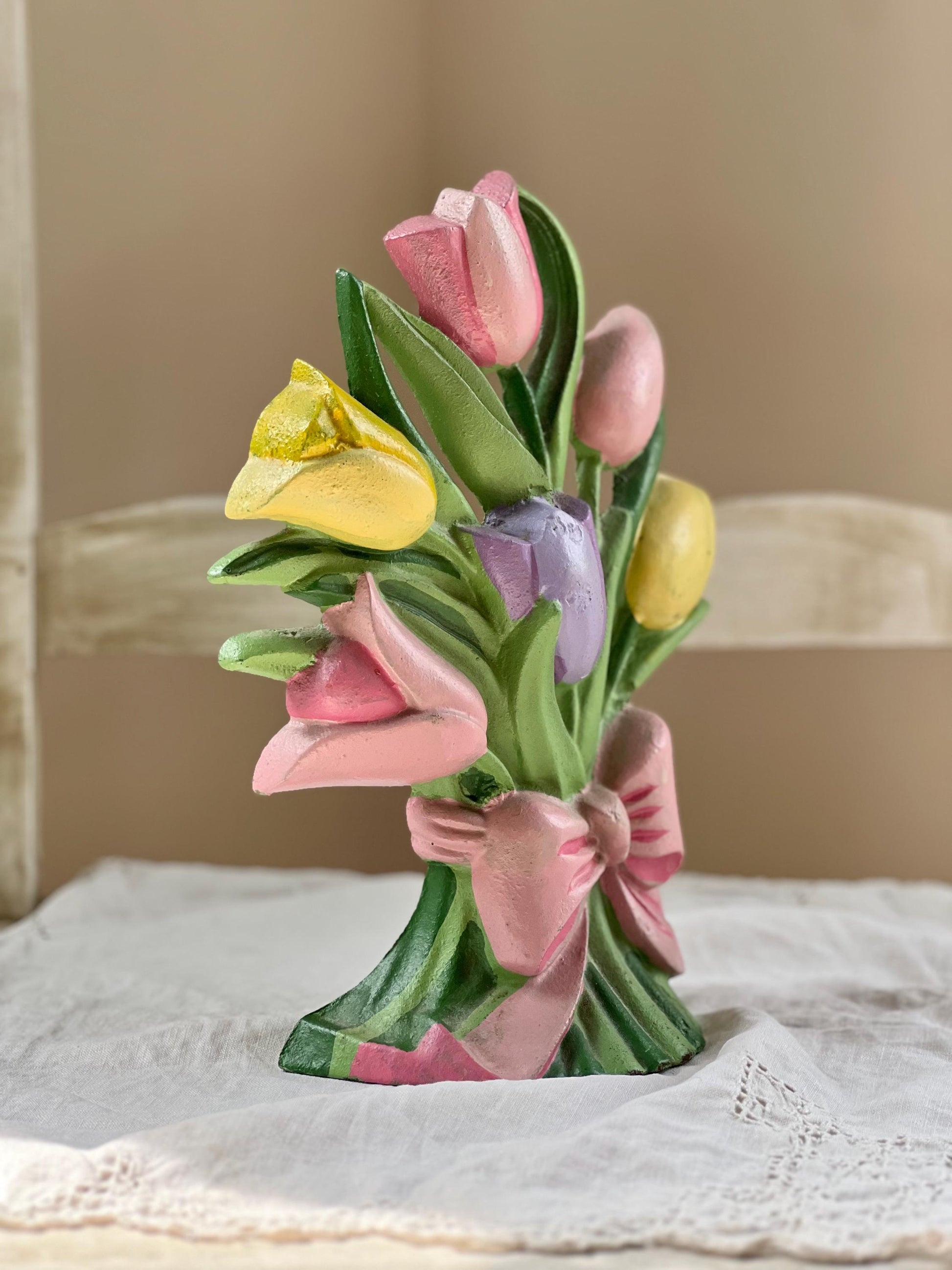 This is a beautiful vintage cast iron doorstop in the shape of a tulip bouquet tied with a pink ribbon.