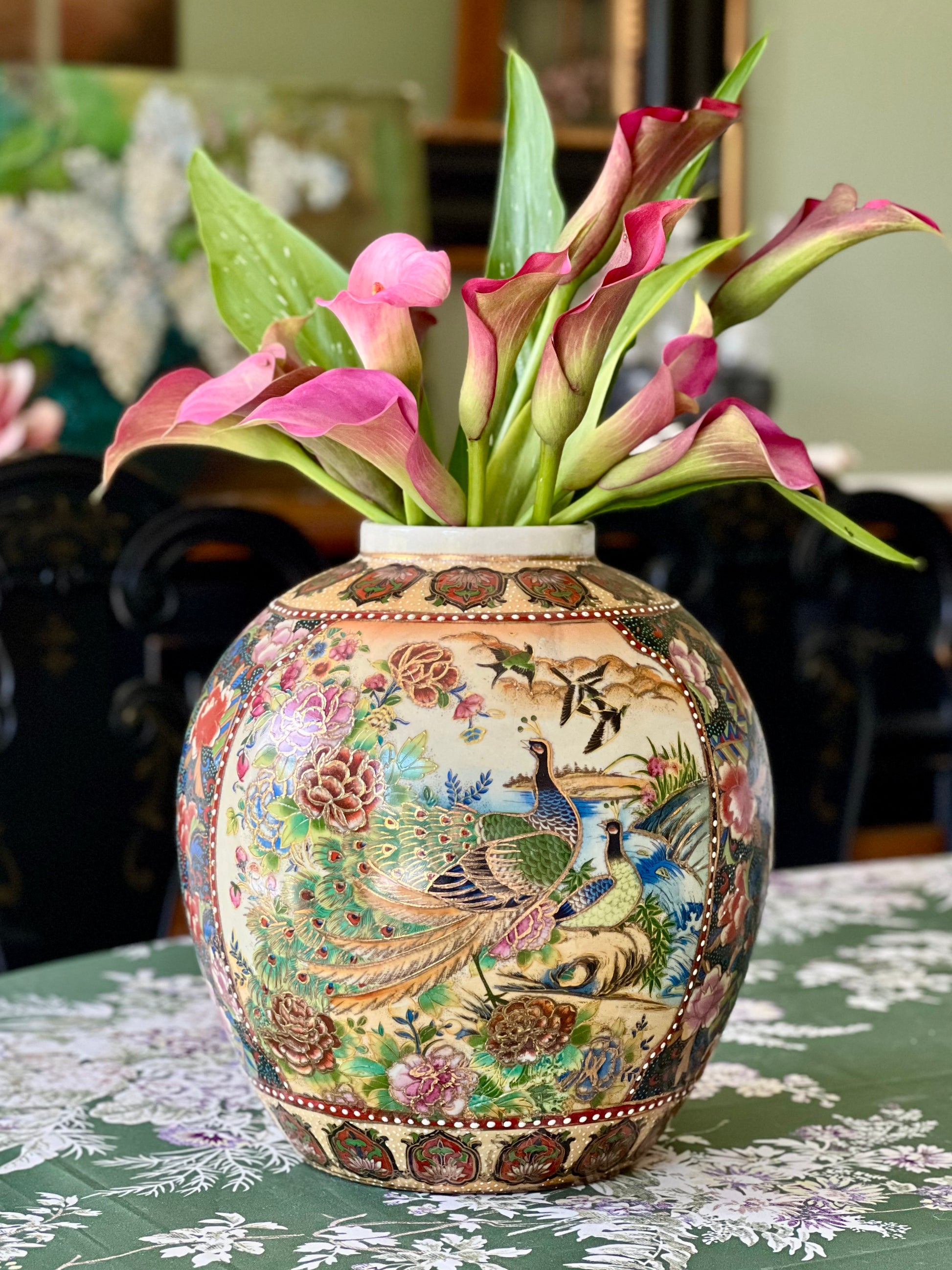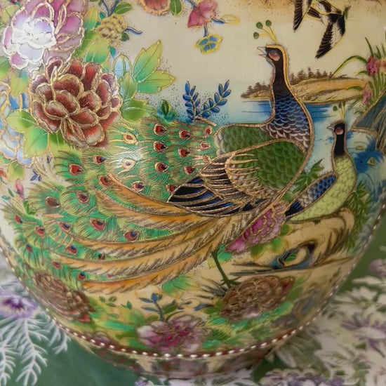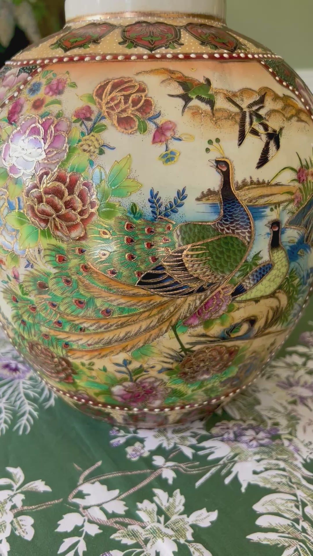 This is a beautiful late 20th century hand painted jar or vase by Royal Satsuma. This vibrant piece features alternating panels of flowers, peacocks & birds. The colors are incredible! There are gold gilt & moriage details. There is no lid, however it makes a gorgeous vase for flowers & displays beautifully as is.