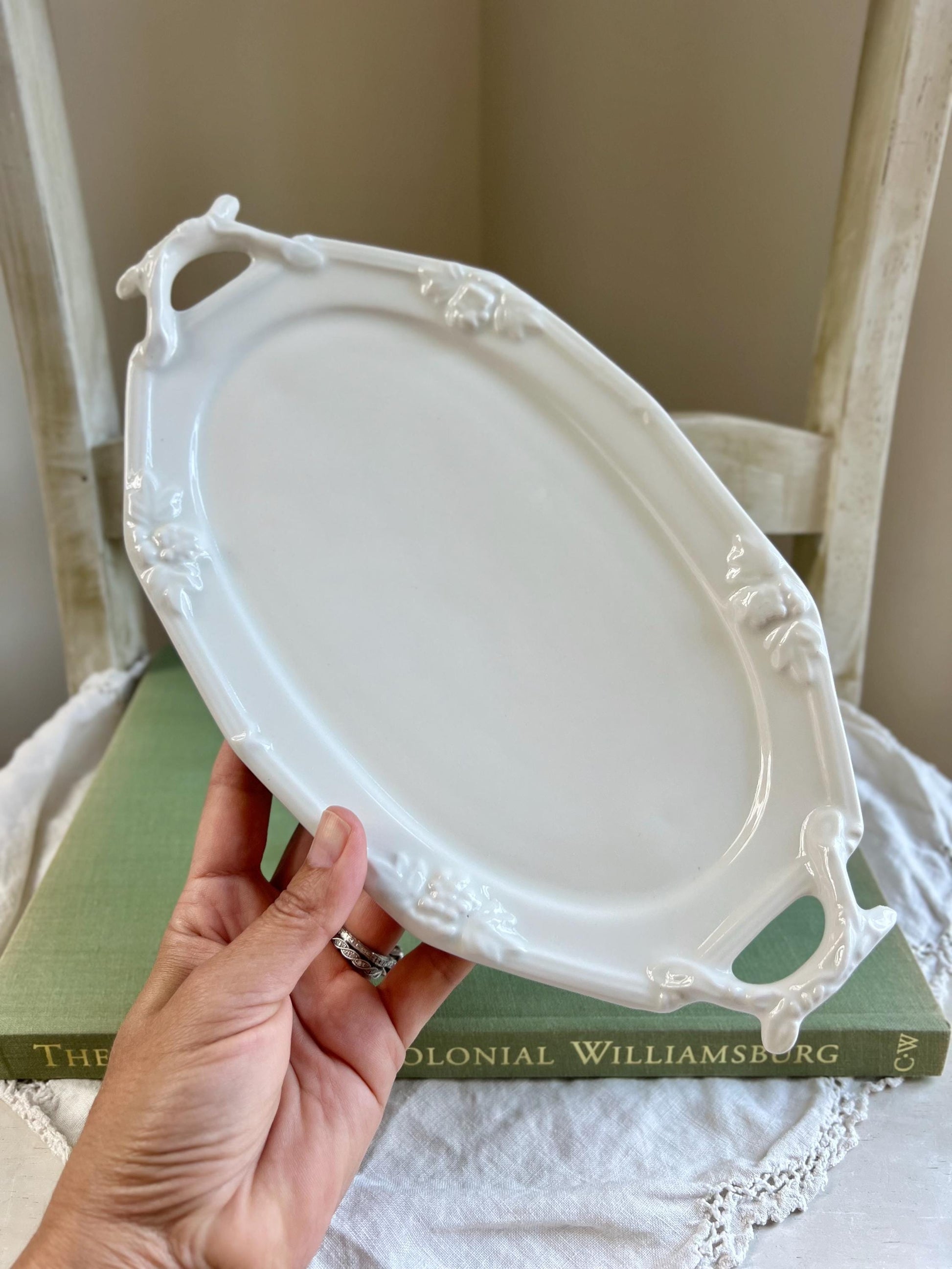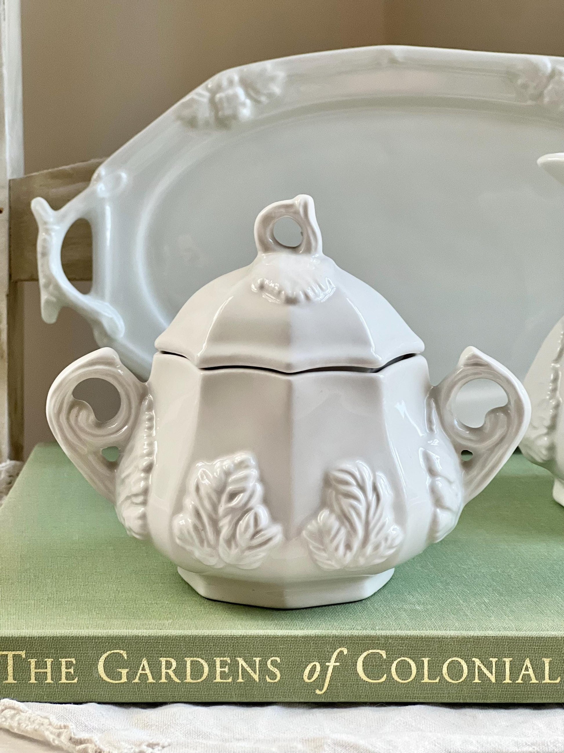 This is a gorgeous 3 piece vintage ironstone creamer & lidded sugar set, complete with a matching tray for serving or display.