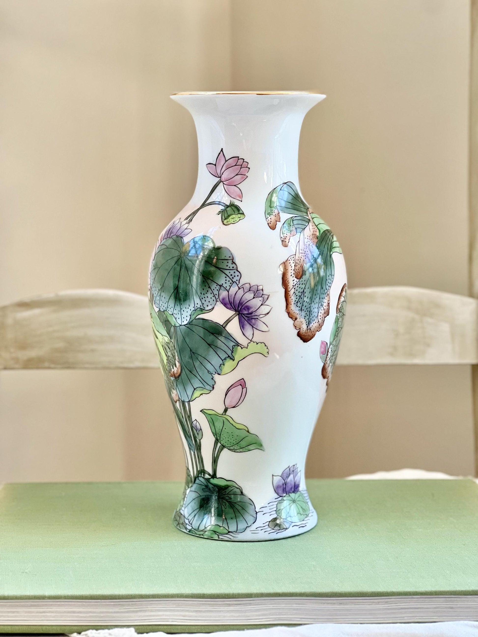 Beautiful Vintage Water Lily Vase, Vintage Toyo Macau Hand Painted Chinese Porcelain Vase with Lily Pads, 10" tall