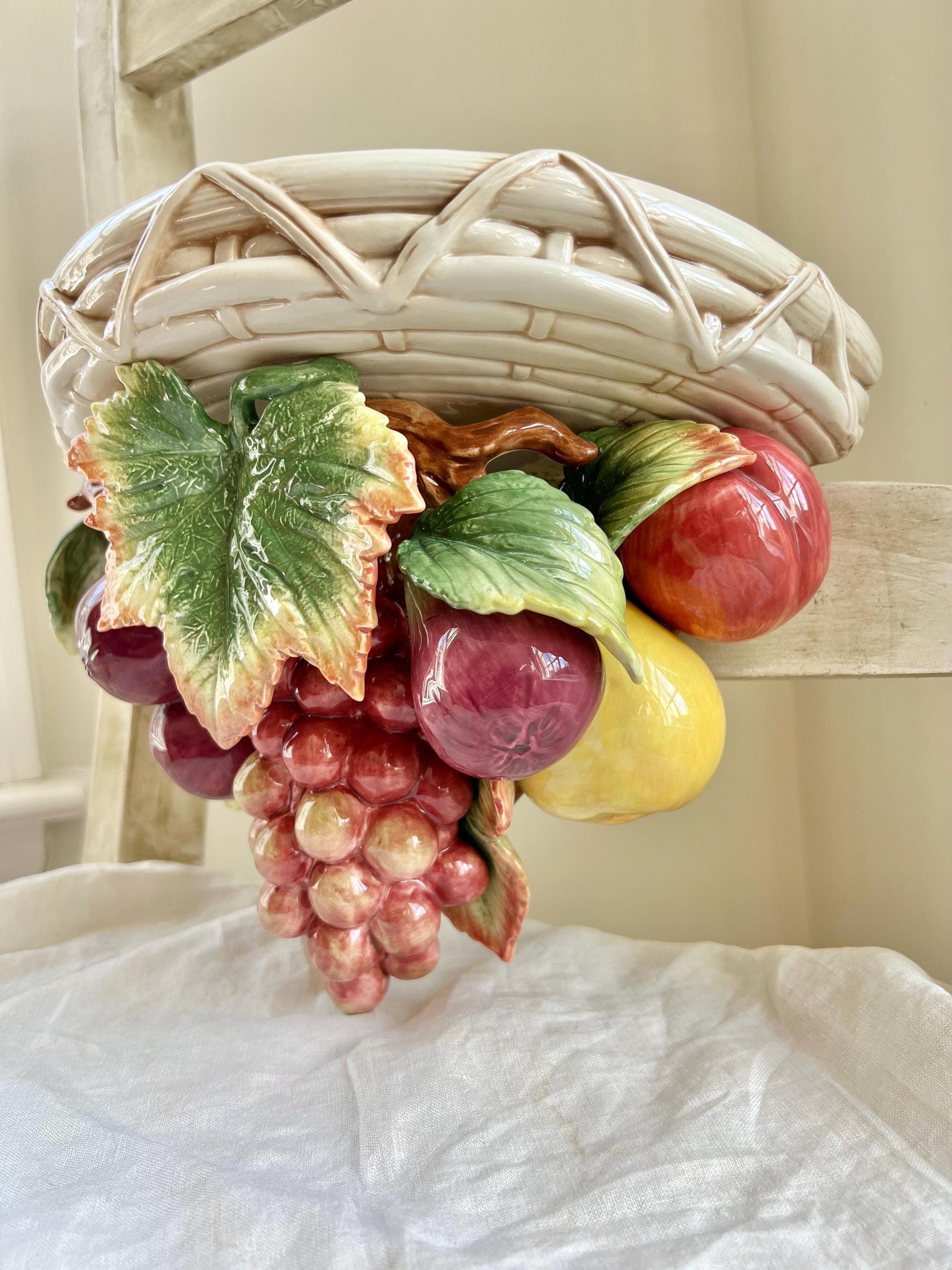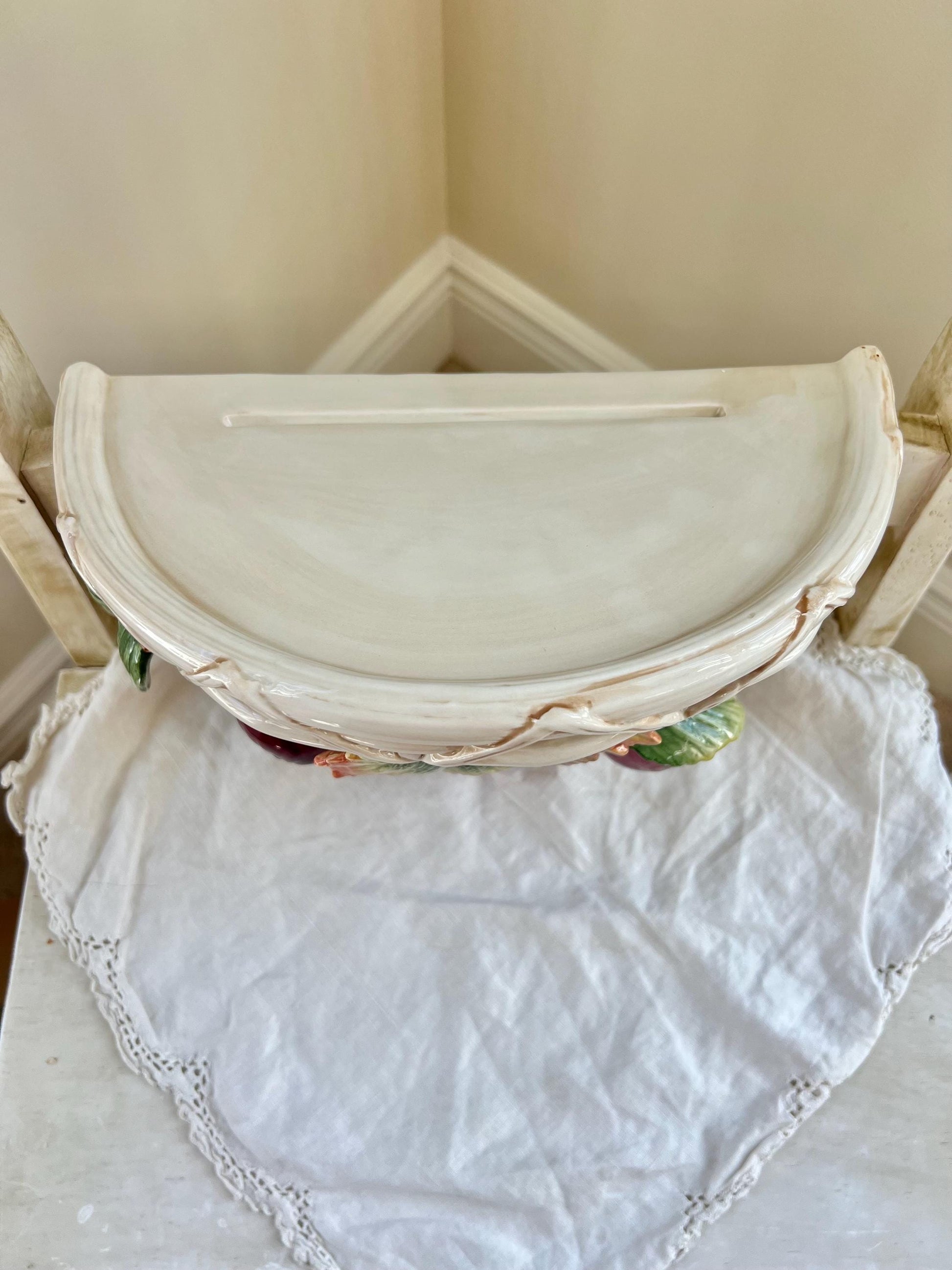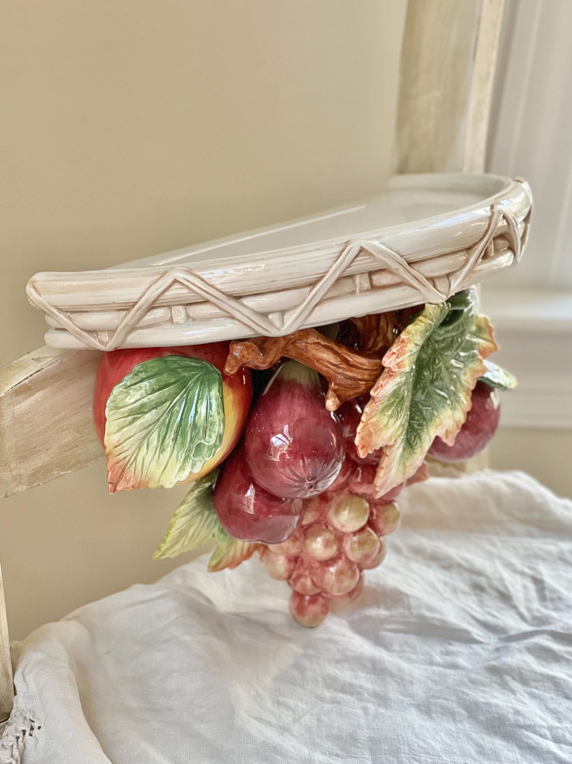This is a vibrant and cheerful Fitz and Floyd Classics Country Gourmet floating shelf to adorn your kitchen or space. The wall shelf has a slot on the top to display a decorative plate or piece of artwork. The sculptural ceramic shelf features a bounty of colorful fruit amongst grapes, leaves & vines. The top shelf portion has a basketweave design. A beautiful and functional piece!
