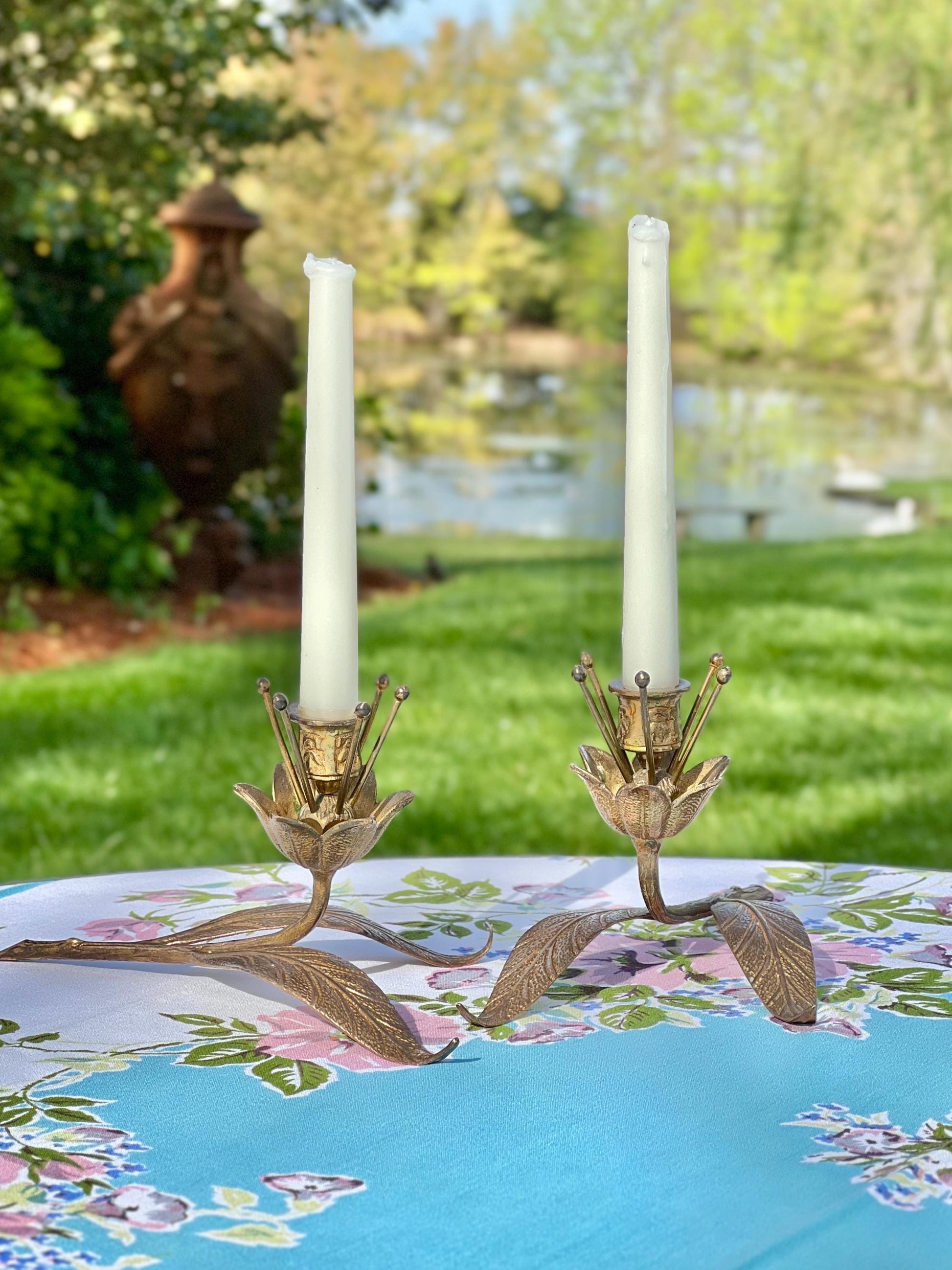 This amazing matched pair of vintage brass flower candle holders will elevate any table! They are a perfect pair but are impressive on their own if separated for styling. They have such a detailed & organic design! I love the leaves & stems.