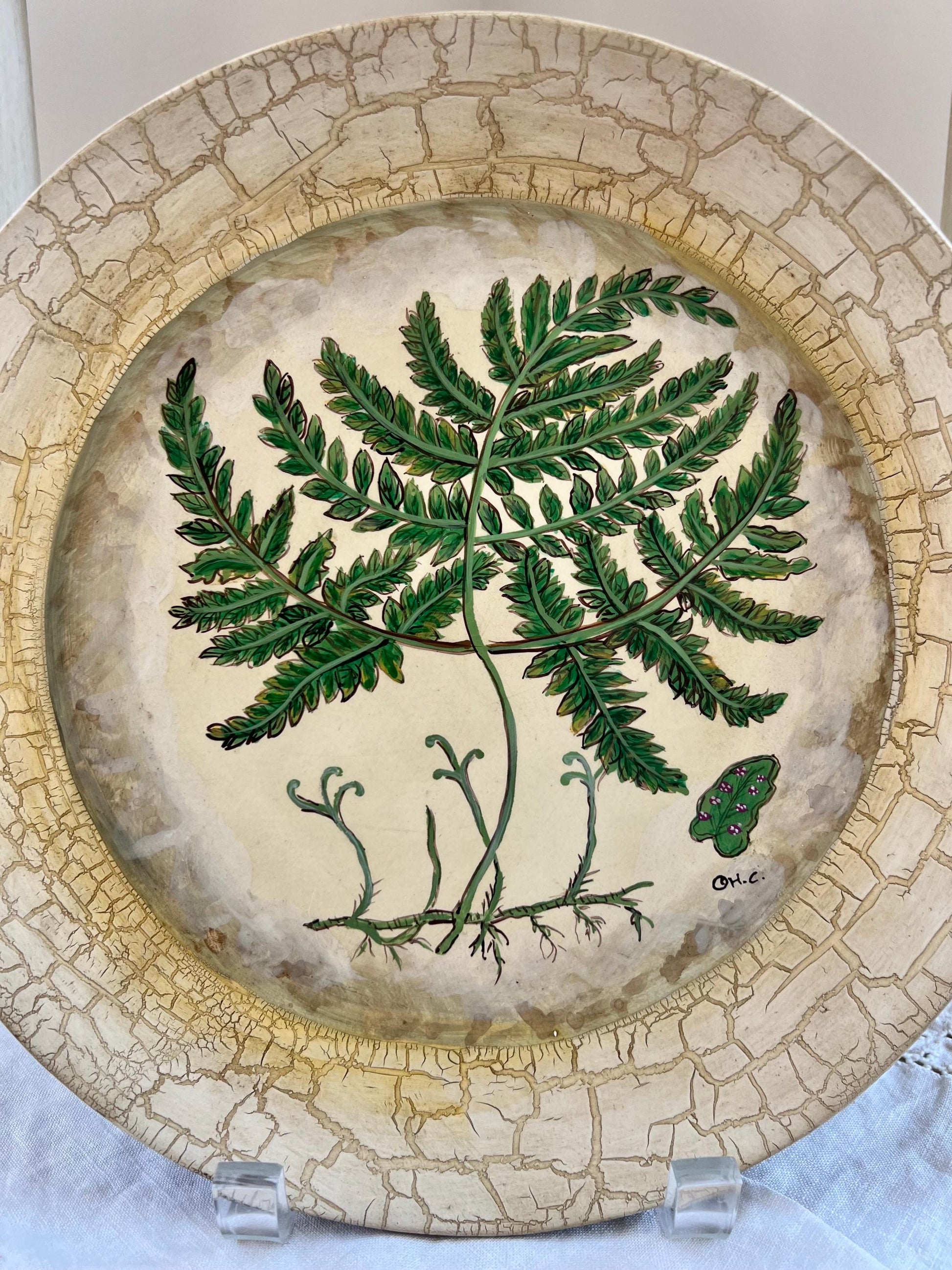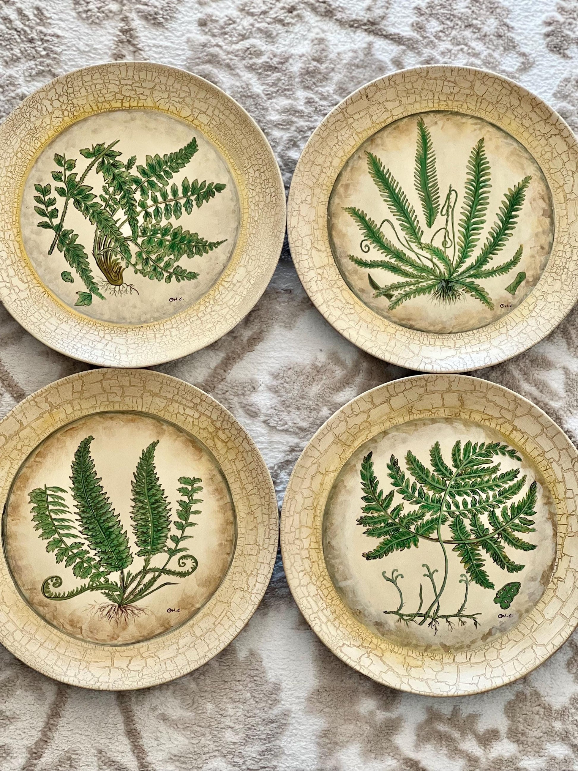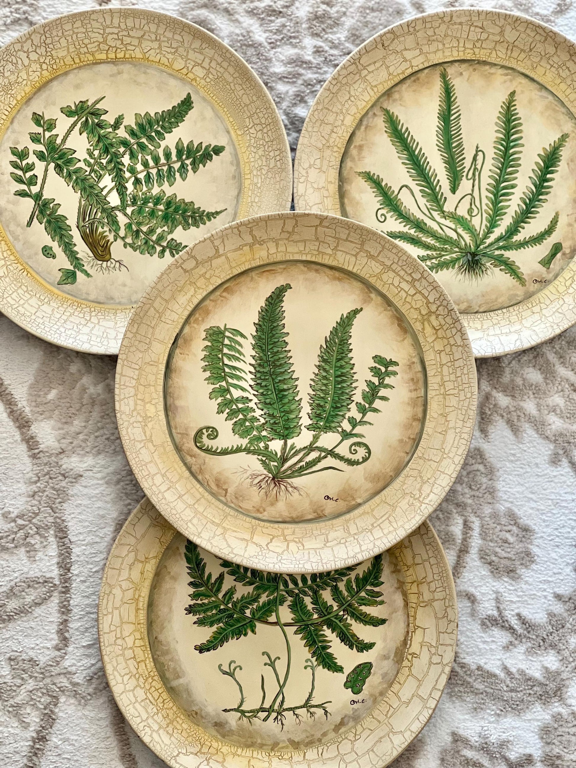 This is a set of 4 (four) hand painted & artist signed designer plates featuring the most beautiful series of ferns. The 10" decorative plates have a very heavy feel. The crackle border is textured to the touch. The species of ferns differ on each plate and are featured in gorgeous shades of green.