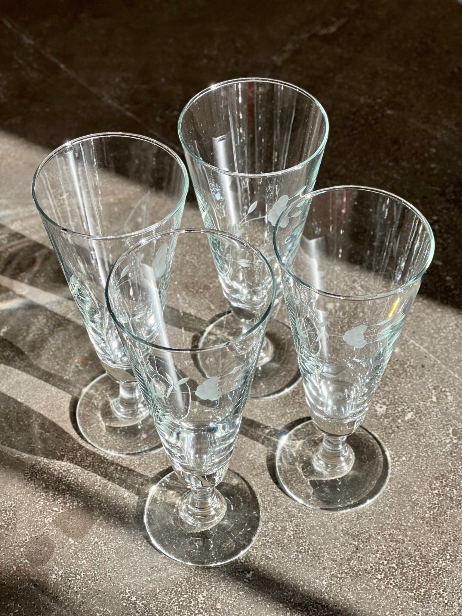 Set (4) Etched Crystal Pilsners, Vintage Etched Floral Glassware
