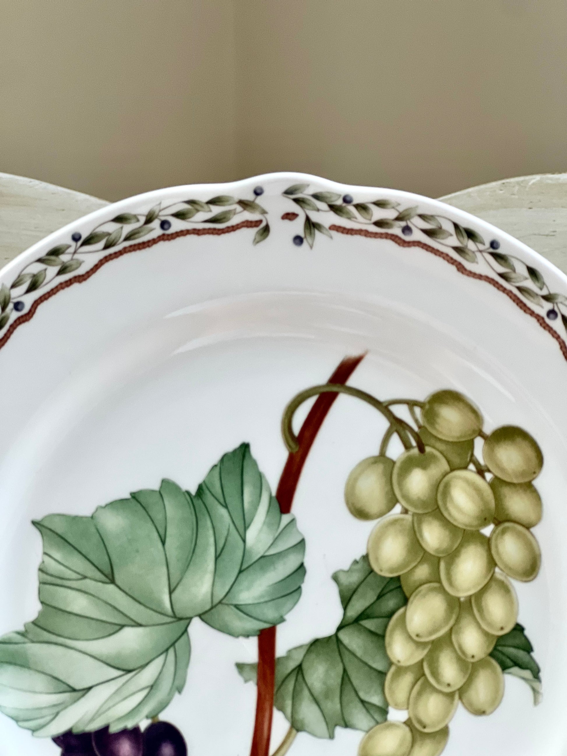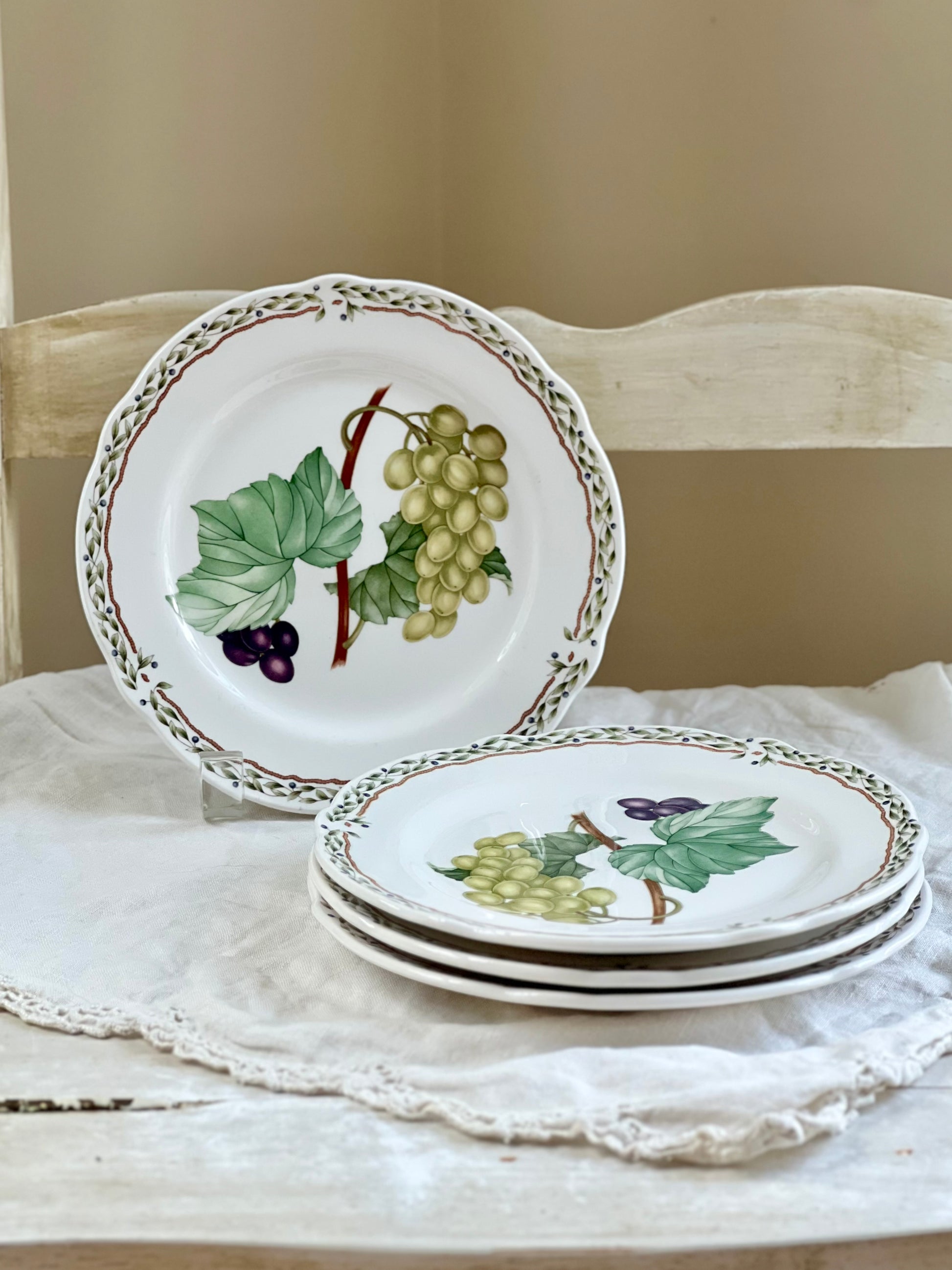 This is a beautiful set of four (4) bread plates by Noritake in the popular Royal Orchard pattern. The rims are gently scalloped & the pattern features red & green grapes. Just beautiful! These plates would be perfect to use for charcuterie & wine. I have 2 sets available!