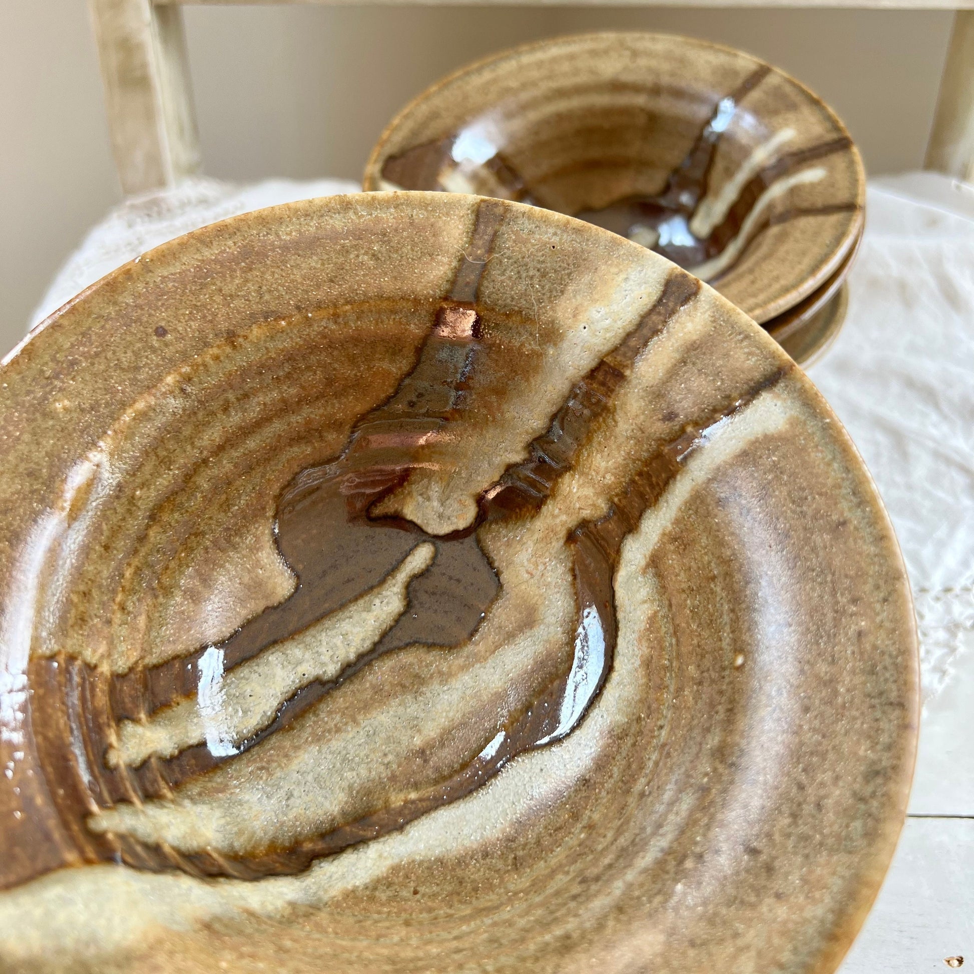 For your consideration is a set of 4 (four) vintage signed studio pottery salad or soup bowls from Lair Pottery of historic Kirby’s Mill in Medford, NJ. The pottery studio was owned and operated by Bill & Kathy Lair from 1971 to 1986. These beautiful brown and tan hand-thrown pottery bowls are of wonderful quality and are made to last.