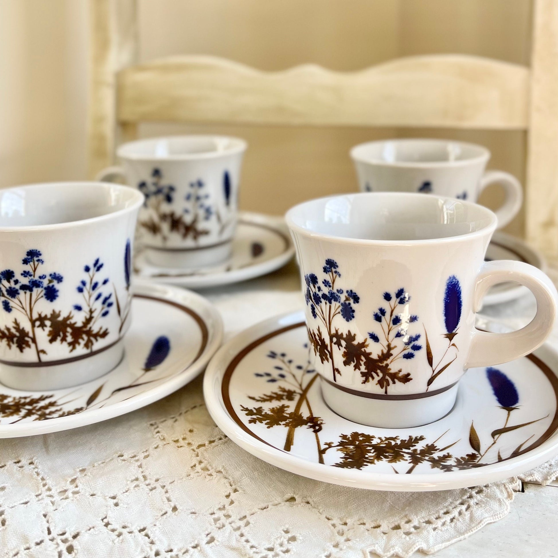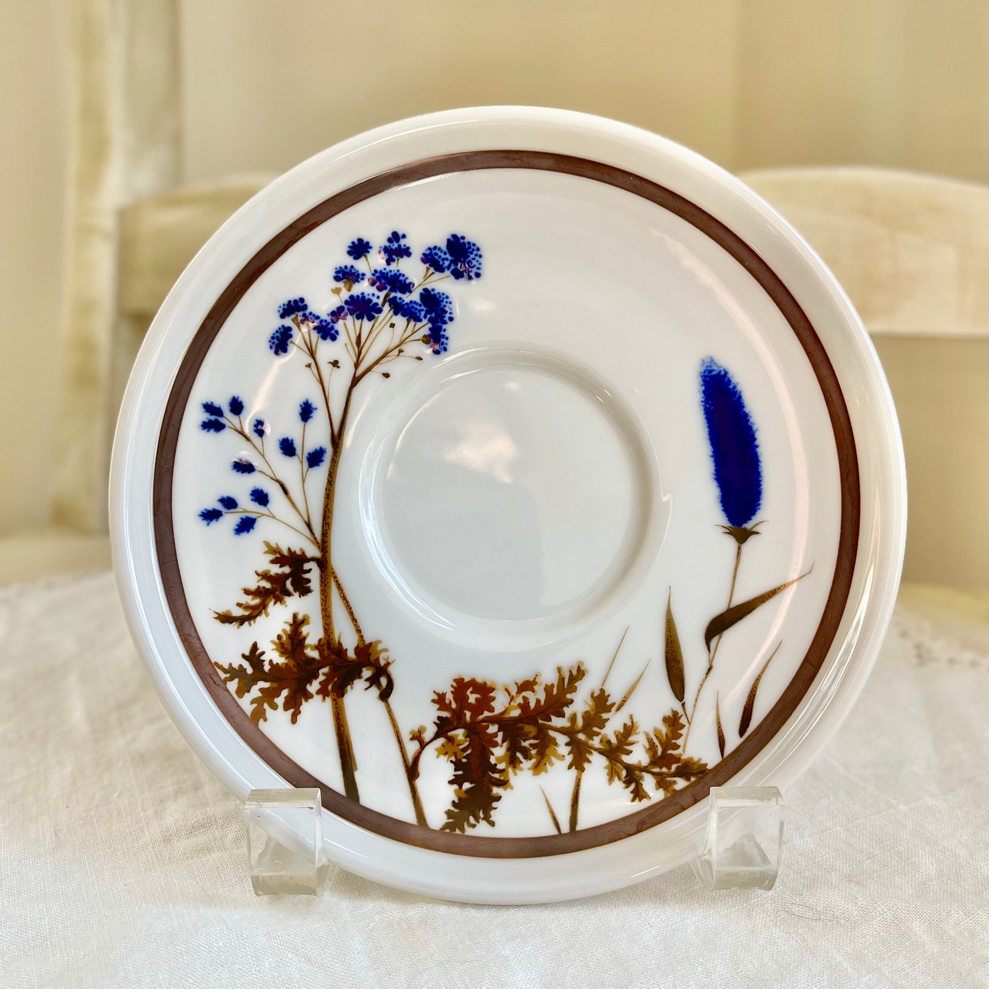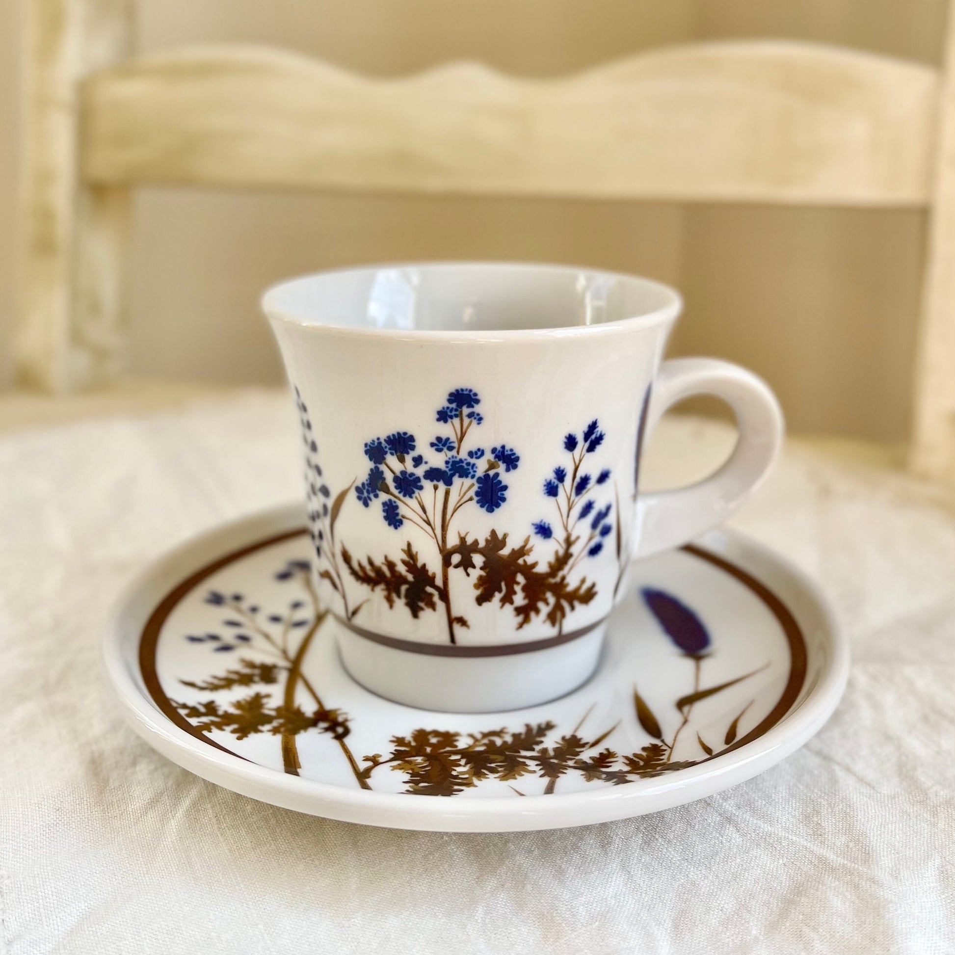 These lovely mugs/cups and saucers feature a silhouette of wildflowers in shades of cobalt blue and brown, outlined in brown trim.