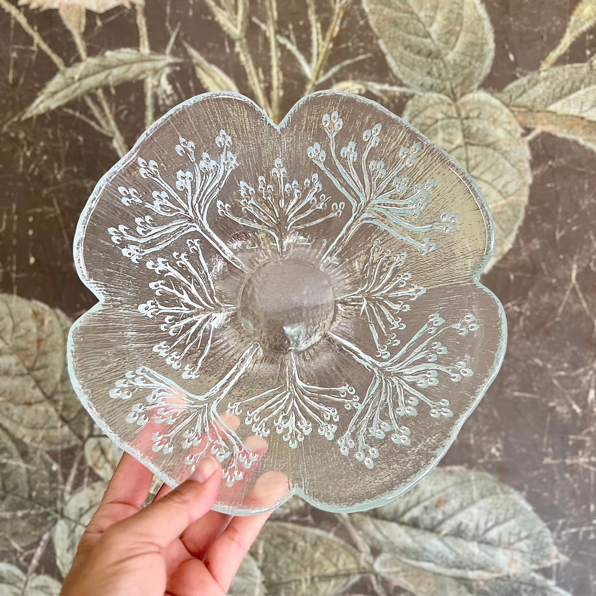 The embossed cow parsley / koiranputki pattern resembles queen anne's lace and has such a beautiful botanical style. The outside of the glass bowl is textured, the inside is smooth.