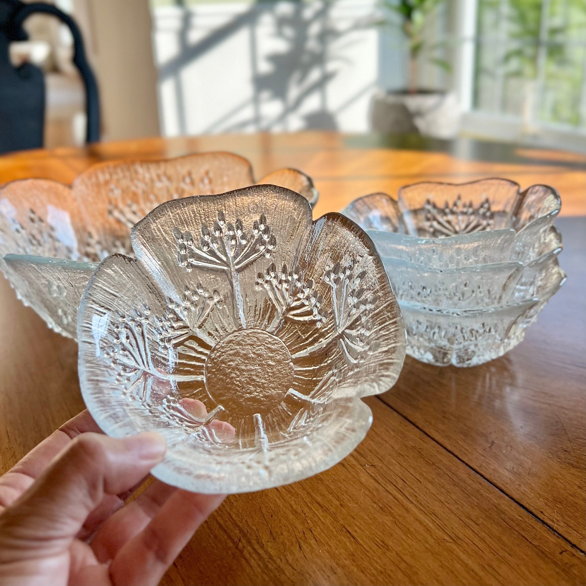 Vintage Glass Serving Bowl & (4) Individual Bowls, Koiranputki (Cow Parsley) by Pertti Kallioinen, Lasisepat Mantsala, Finland