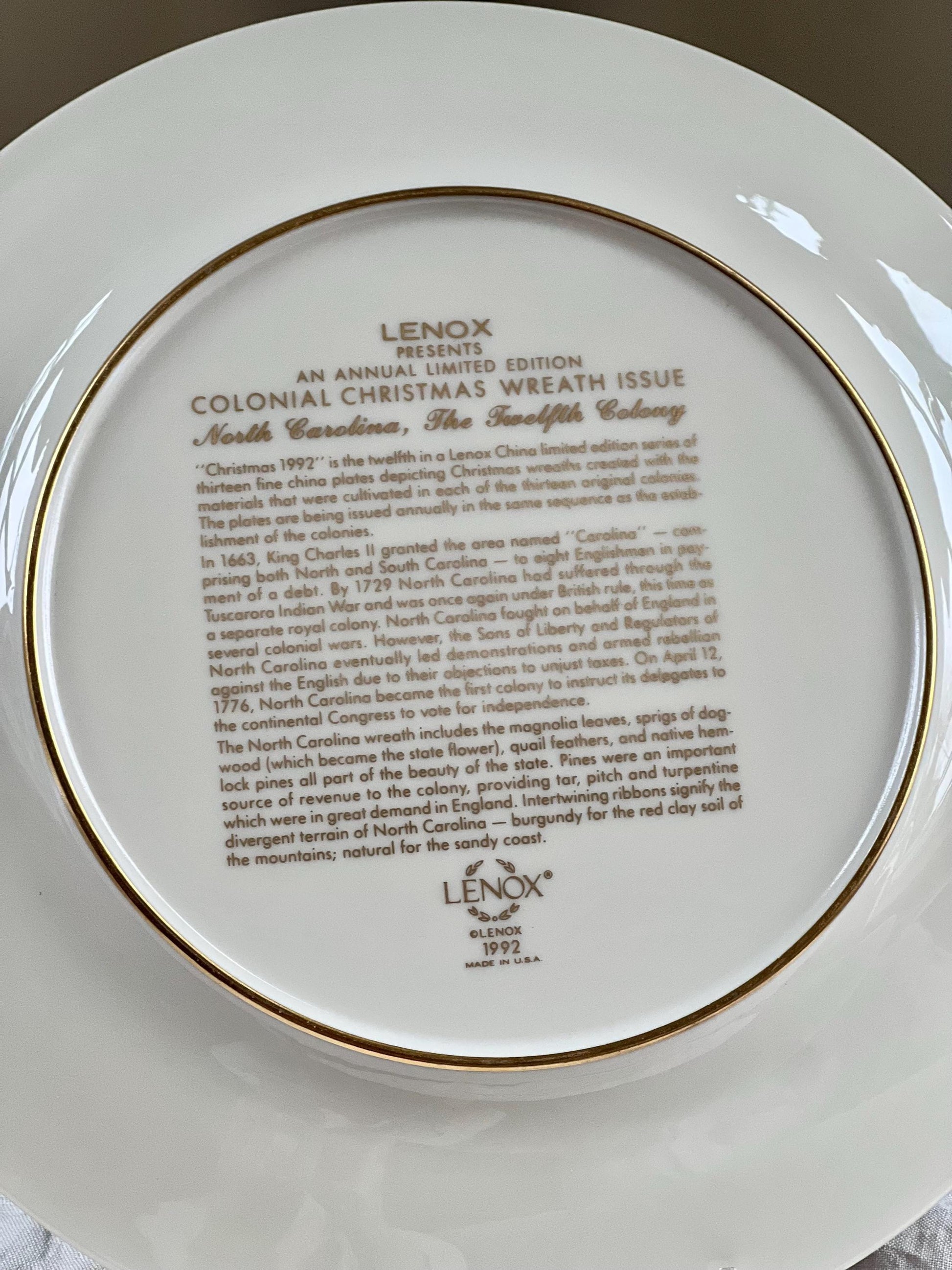 Vintage Lenox Colonial Christmas Wreath "North Carolina, The Twelfth Colony" Collector's Plate, Christmas 1992