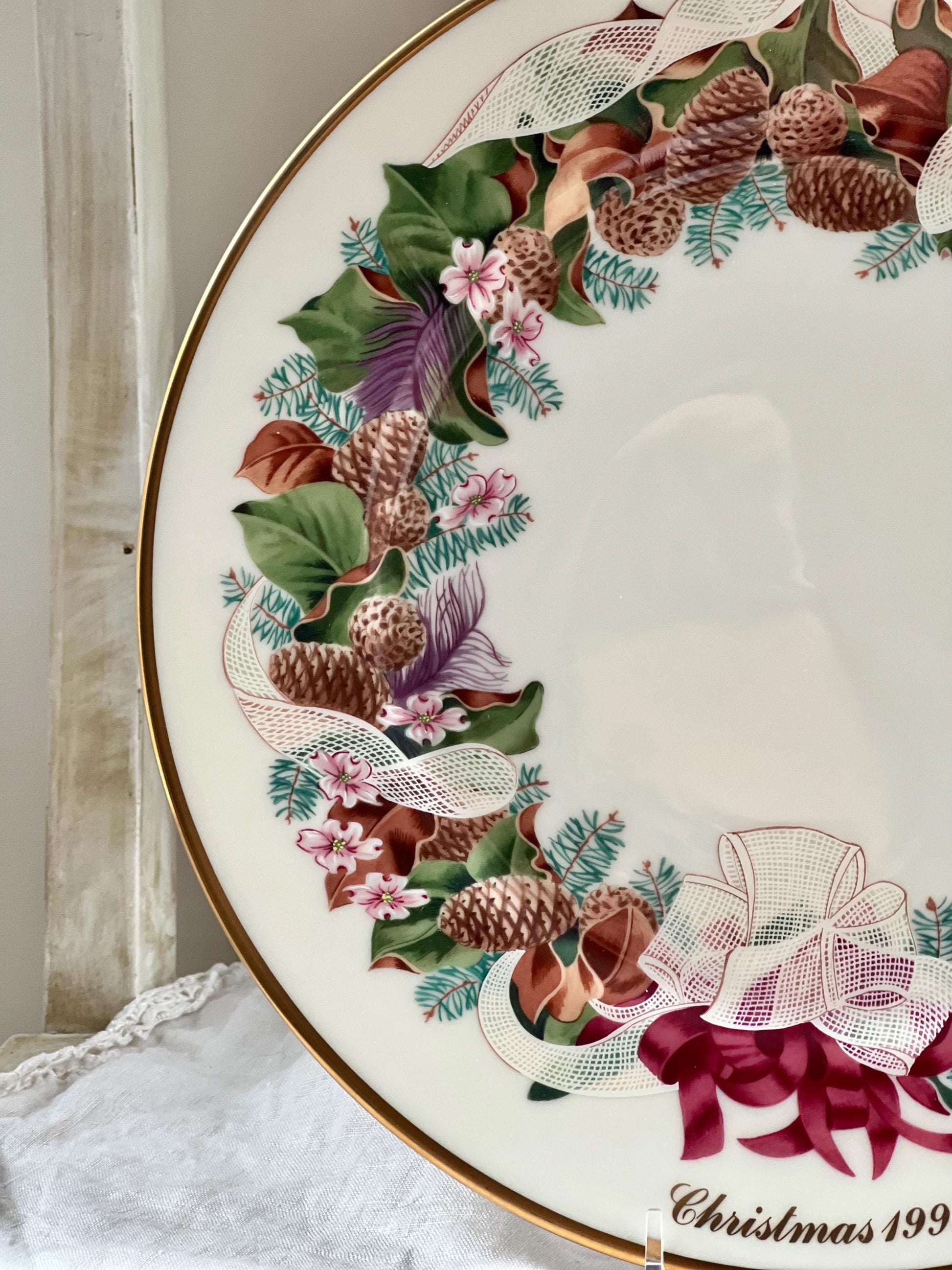 This is a beautiful vintage Lenox plate from the Colonial Christmas Wreath Collection featuring North Carolina, the Twelfth Colony. This is plate number 12 of 13 from the limited holiday series. The lovely North Carolina wreath, issued in 1992, features magnolia leaves, sprigs of dogwood, quail feathers, and native hemlock pines. Intertwining ribbons complete the design. This plate displays beautifully and would make a lovely addition to a cabinet or gallery wall.