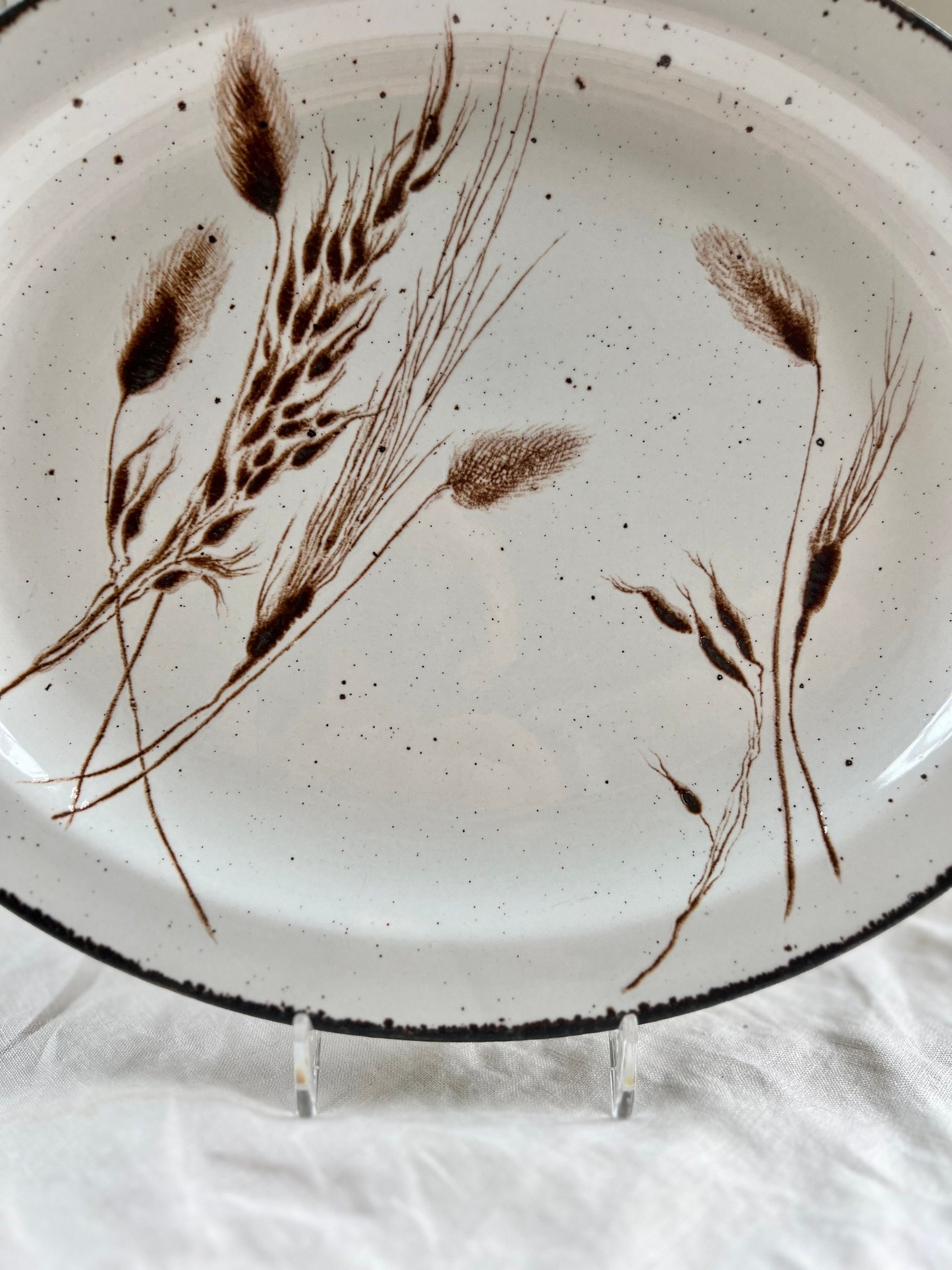 This is a lovely vintage "Wild Oats" platter by Midwinter Pottery of England. The pattern features a brown wheatsheaf design on a stoneware background with a dark brown edge. A beautiful piece to display, use, or add to a collection.