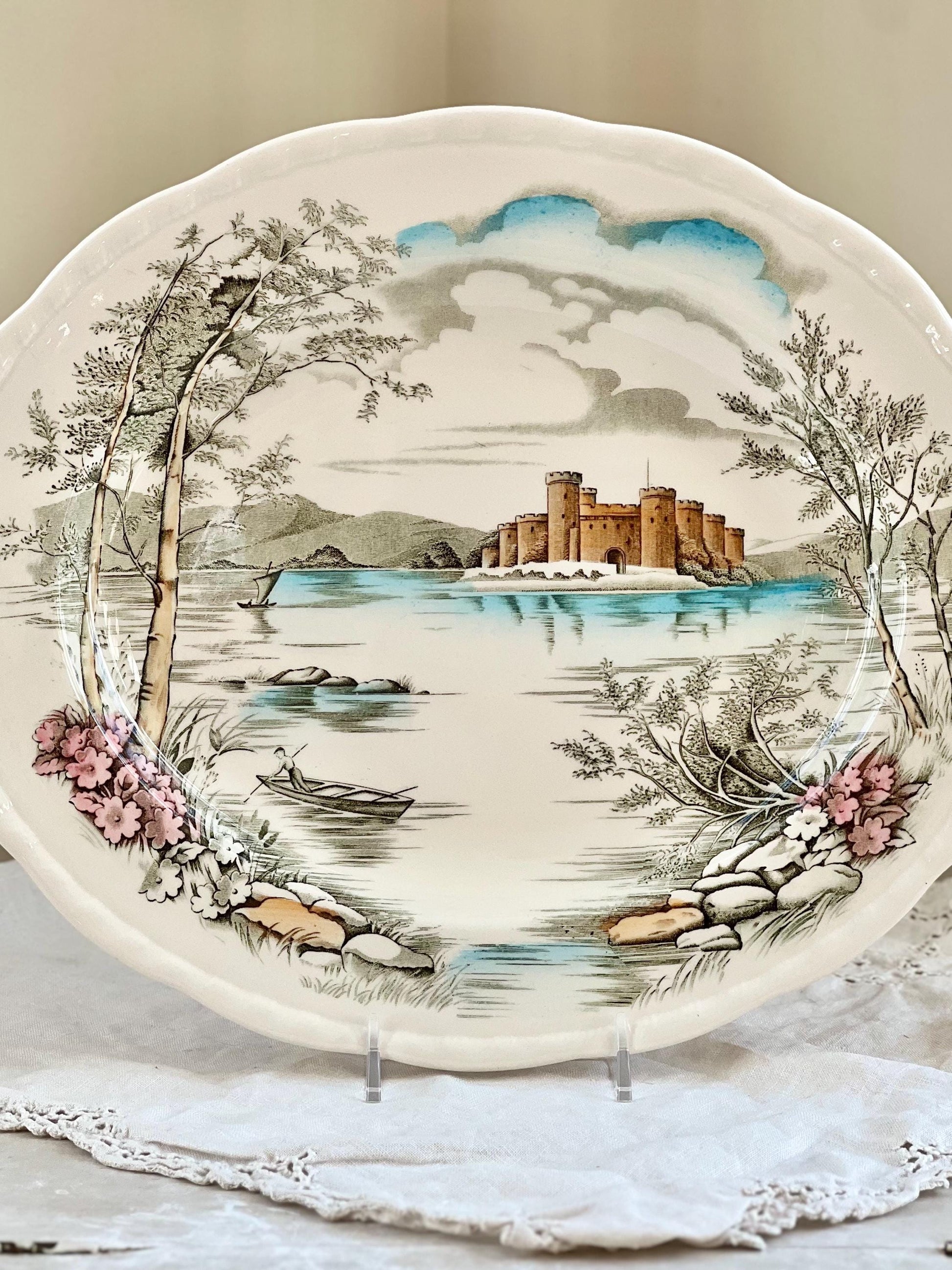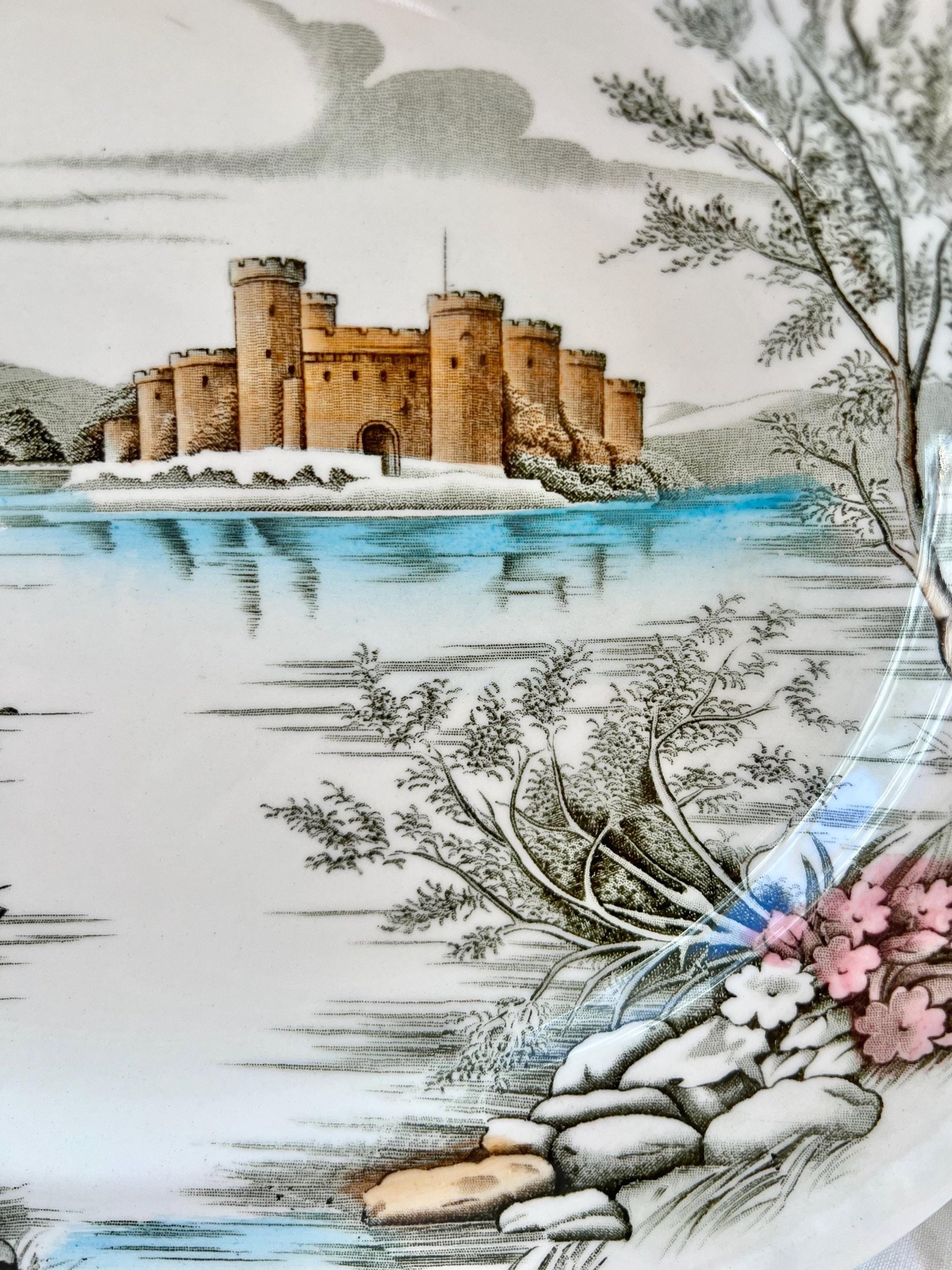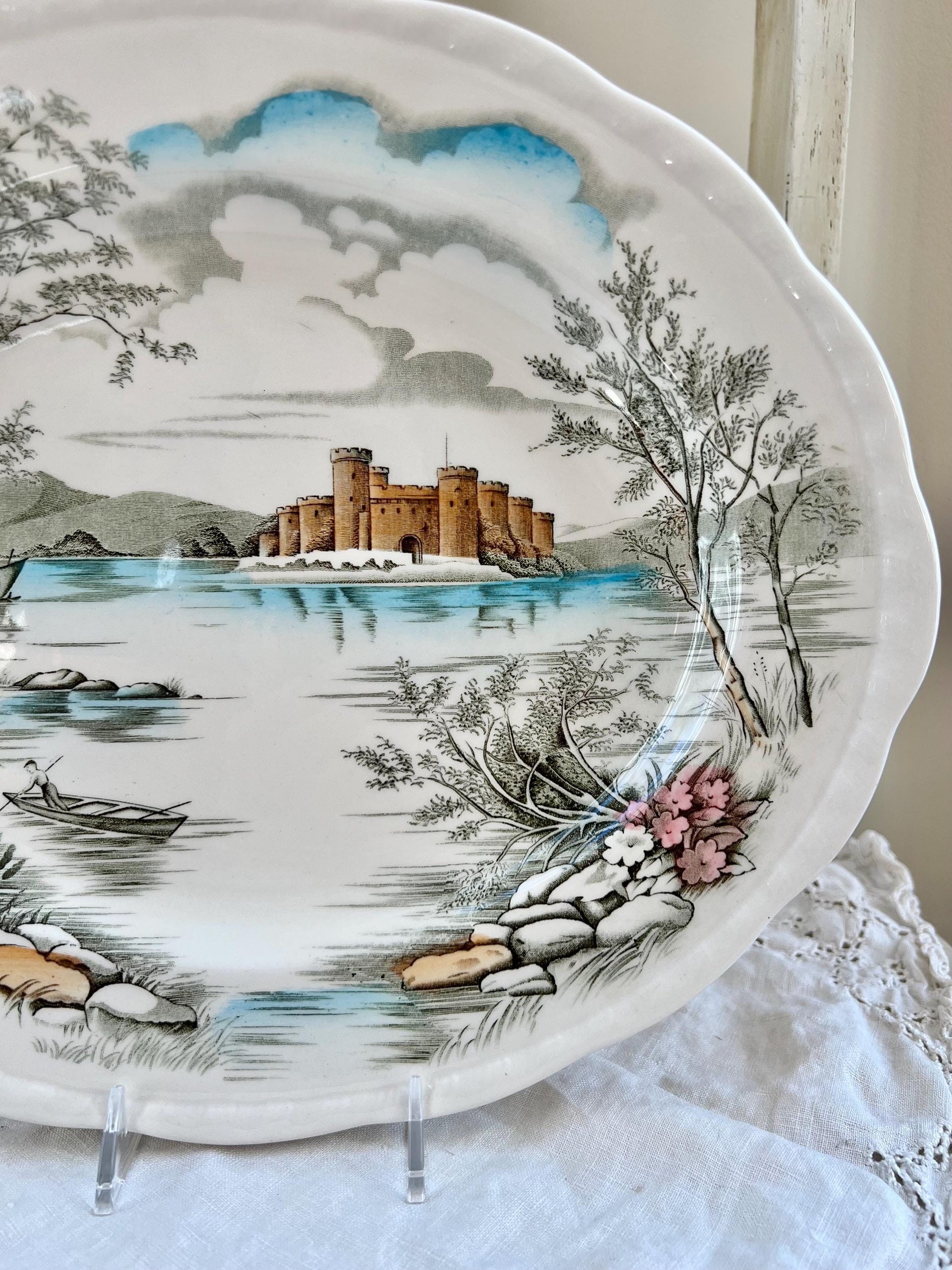 This is a beautiful multicolor "Queen's Castle" 12" oval platter by Alfred Meakin, England. The transferware pattern features a castle on a lake surrounded by trees, flowers, vegetation and mountains. The prominent colors are brown, blue and pink on the creamy white ironstone. The edge of the platter is gently scalloped, and the border has an embossed rope detail.
