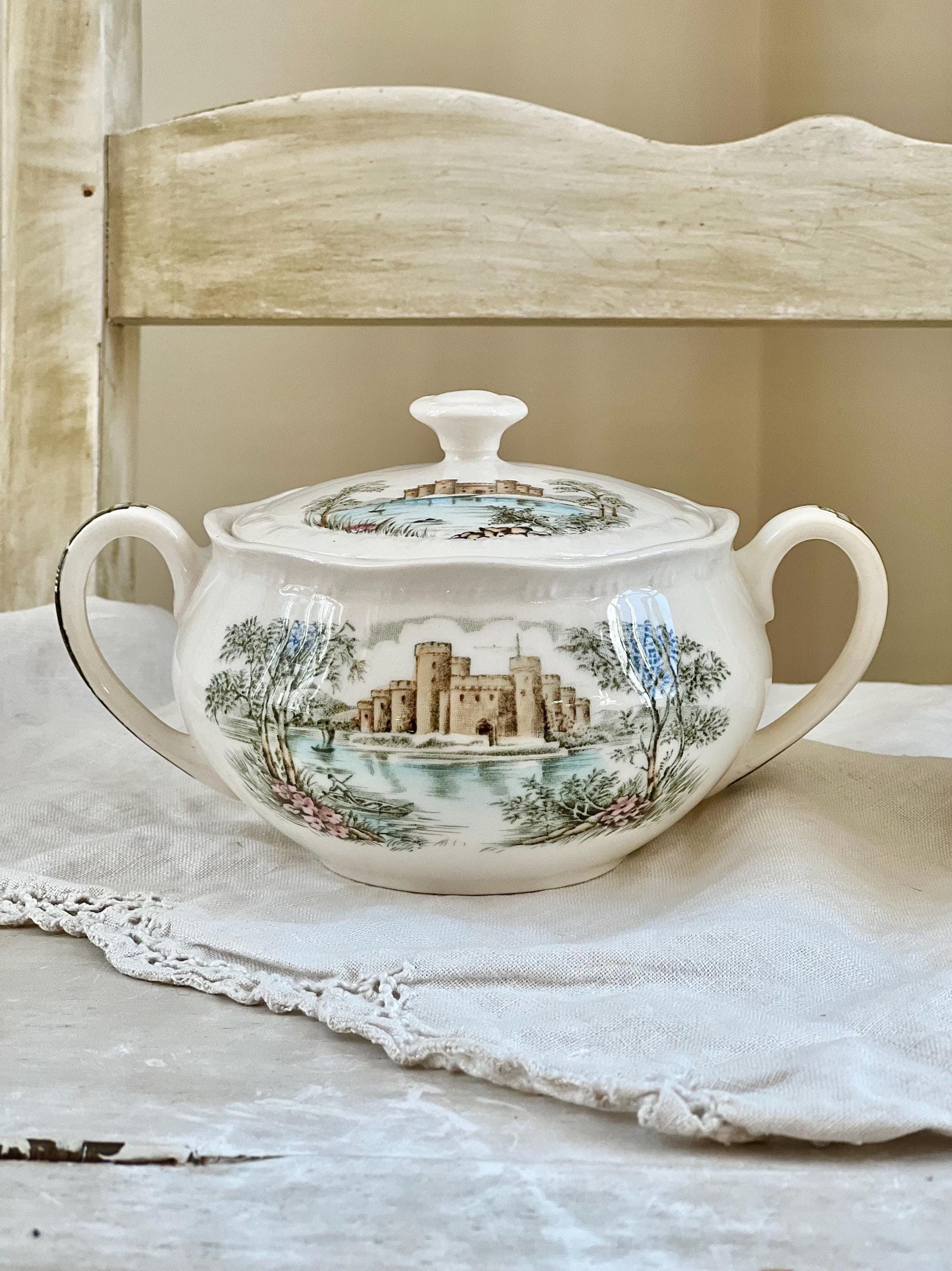 This is a beautiful multicolor "Queen's Castle" creamer & sugar set by Alfred Meakin, England. The transferware pattern features a castle on a lake surrounded by trees, flowers, vegetation and mountains. The prominent colors are brown, blue and pink on the creamy white ironstone. The rim of the pieces are gently scalloped, and the borders have an embossed rope detail.