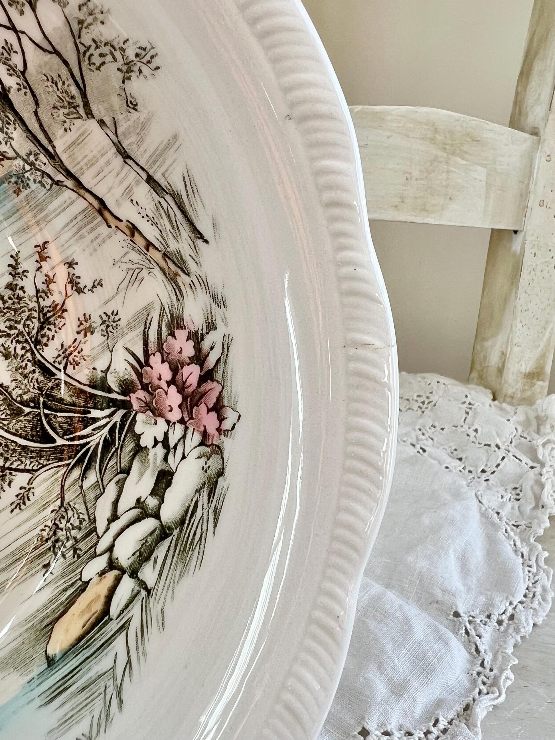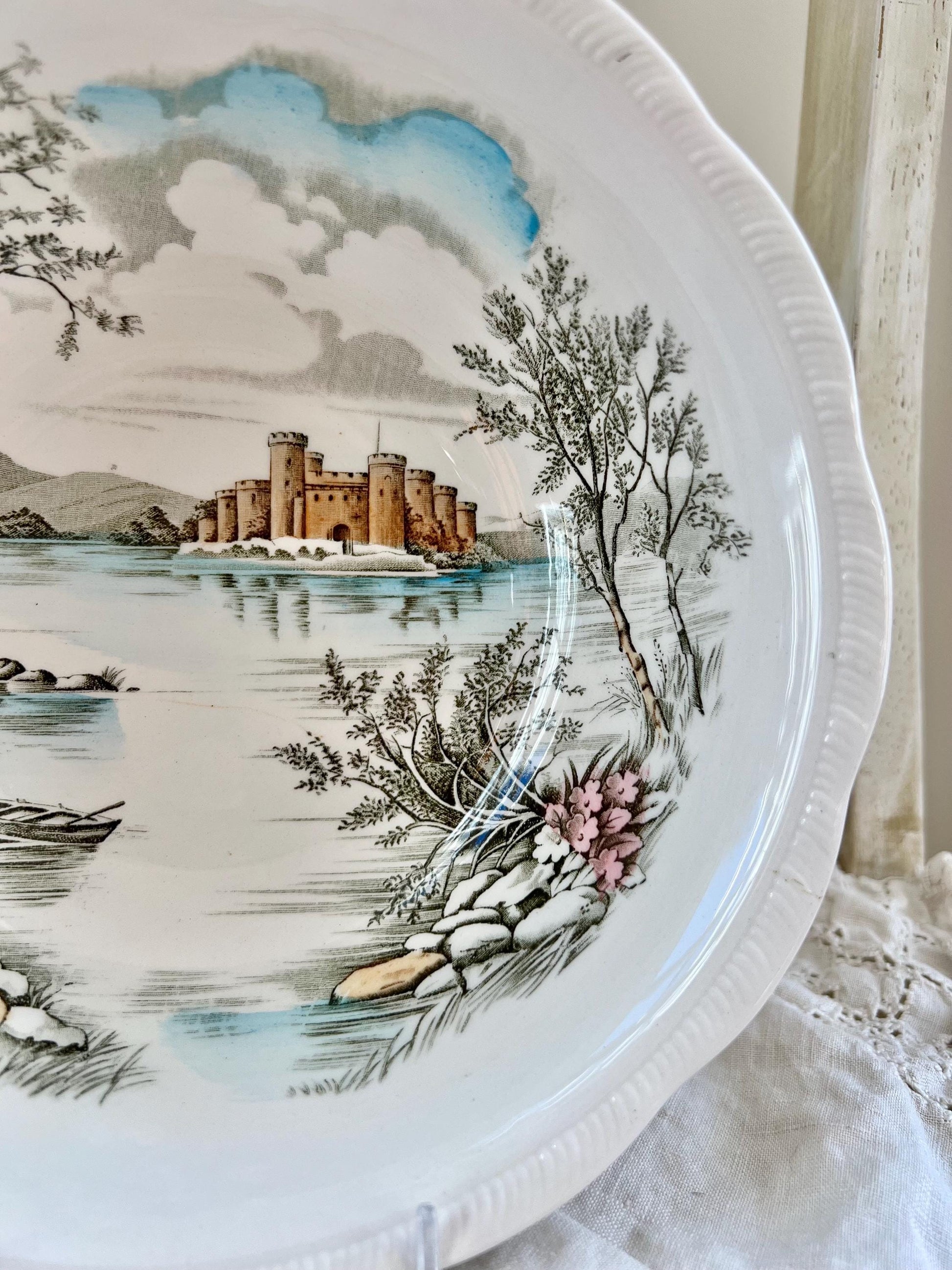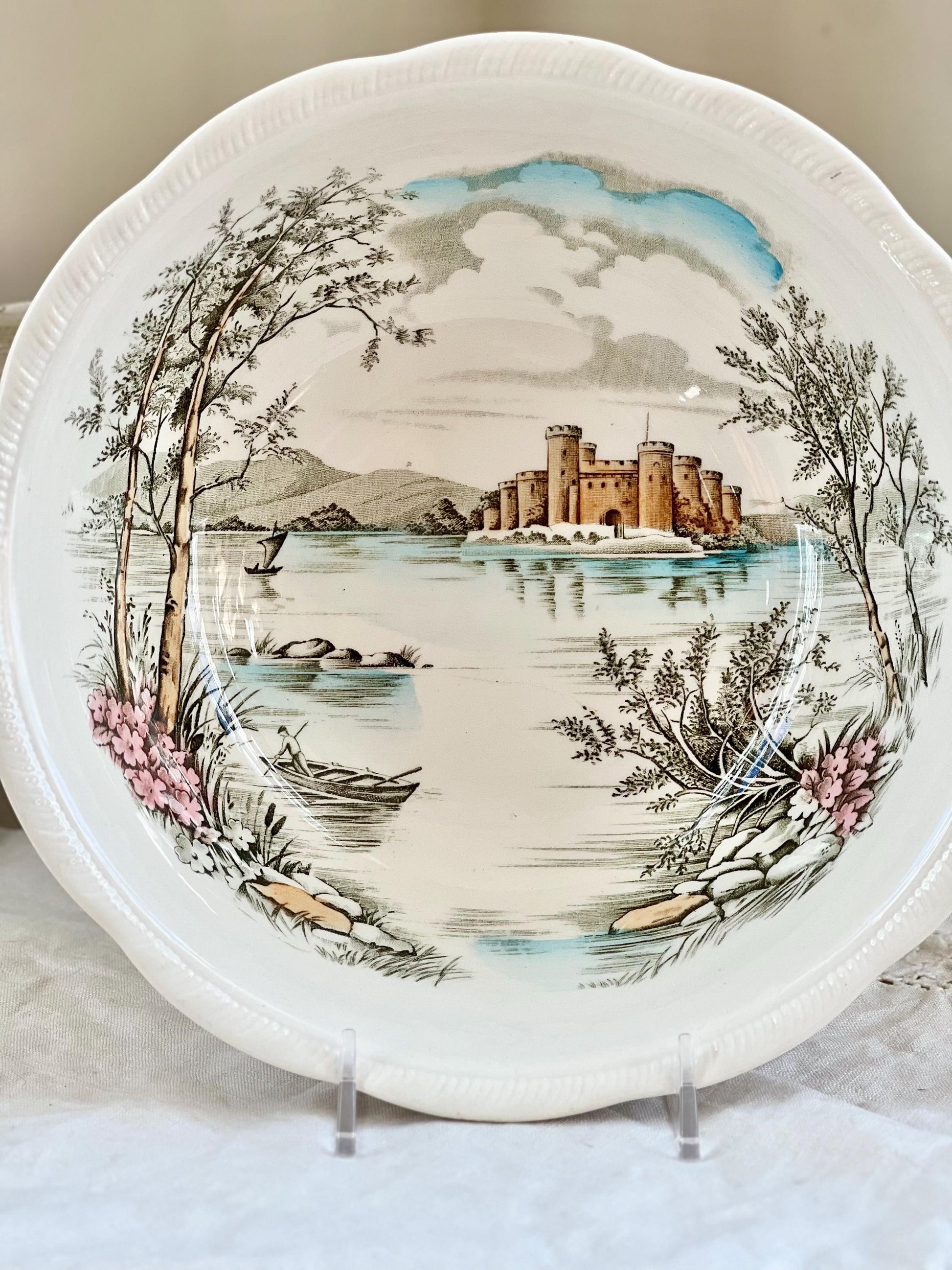 This is a beautiful multicolor "Queen's Castle" 8.5" round vegetable serving bowl by Alfred Meakin, England. The transferware pattern features a castle on a lake surrounded by trees, flowers, vegetation and mountains. The prominent colors are brown, blue and pink on the creamy white ironstone. The edge of the bowl is gently scalloped, and the border has an embossed rope detail.