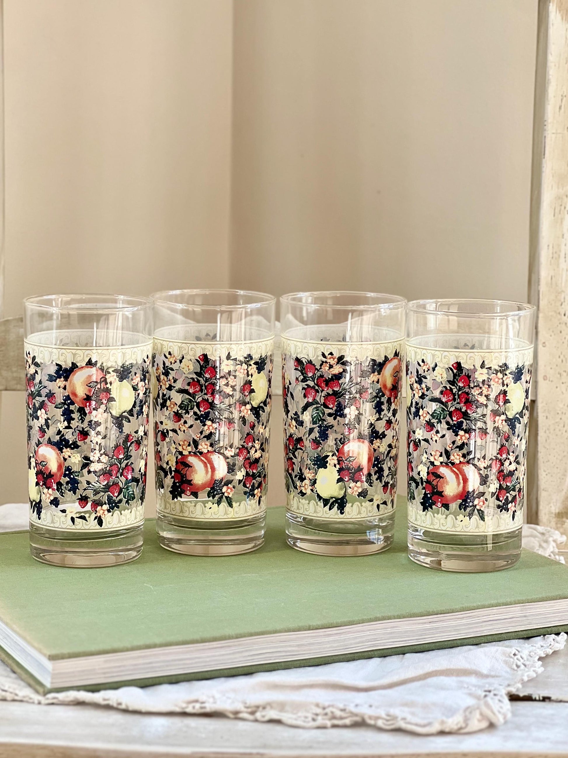 Vintage Set (4) Avon Sweet Country Harvest Tumblers, 12 oz Drinking Glasses with Fruit & Flowers